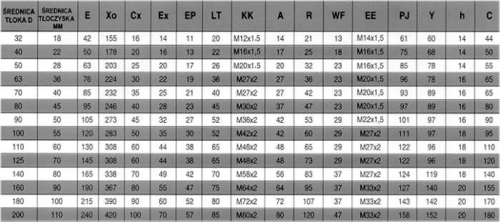 Uszczelnienia i inne elementy typu łożyska są wykazane w Karcie Gwarancyjnej poszczególnych typów cylindrów.